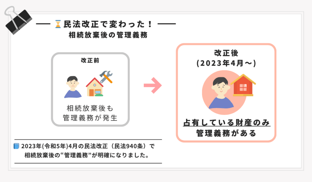 - 2023年(令和5年)の民法改正で、管理義務の範囲が明確化された。