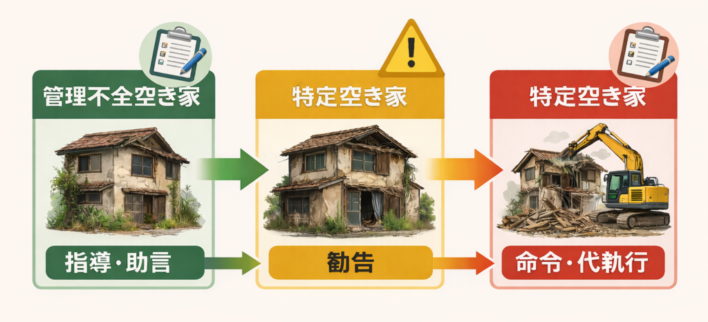 管理不全空き家“予備軍”特定空き家“重症”と考えると理解しやすいです。