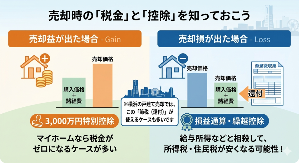 利益に対して「譲渡所得税」がかかります。ただし、マイホームの売却であれば「3,000万円の特別控除」が使えるケースが多いです。(所有期間や居住実態など、一定の適用条件があります。詳しくは税務署や税理士などの専門家にご確認ください。)